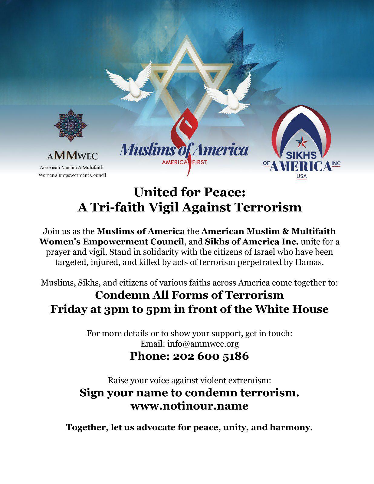 In collaboration with “Muslims of America” and “Sikhs of America,” AMMWEC organized a vigil to express solidarity with the citizens of Israel. The event, led by Sajid Tarar, Jasdip Singh, and Anila Ali, took place in front of the White House. Participants joined hands with Jewish Americans to condemn Hamas’s brutality against Israeli citizens, including Muslims who suffered from kidnappings and murders on October 7. Read the Forbes story here.